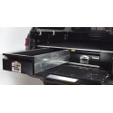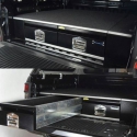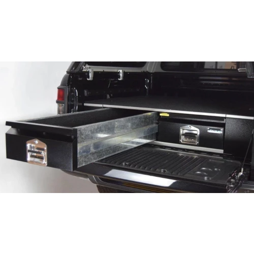 Har du en pickup og ønsker bedre orden på småting du har med deg bak på planet har vi løsningen til deg. Hold lasten til din organisert og tilgjengelig med et sett med AEROKLAS skuffer. AEROKLAS skuffer er lette, men likevel sterke takket være deres galvaniserte stålchassis som er ferdig med glassfylte polypropylen topppaneler og vingesett (sidepaneler). Sidepanelene kan løftes opp og man har da et praktisk ekstra oppbevaringsrom på hver side av skuffeseksjonen. AEROKLAS skuffer bruker et fullstendig forseglet skinnesystem for å sikre at de fungerer pålitelig og skranglefri gang på gang, enten du er på arbeidsplassen, på veien eller i leiren. Hvert systems topppanel og skuffeinteriør er også dekket av slitesterkt marinekvalitets teppe, som møtes av en beskyttende toppkant i aluminium for ekstra holdbarhet. På skuffene er det kraftige låser i rustfritt stål med "slam-shut"-funksjonalitet, som er integrert i en robust svart pulverlakkert fasade. Med en lett konstruksjon, pålitelig funksjonalitet og en rekke bruksområder for kjøretøy med to førerhus, er AEROKLAS-skuffer en robust oppbevaringsløsning for din 4x4.