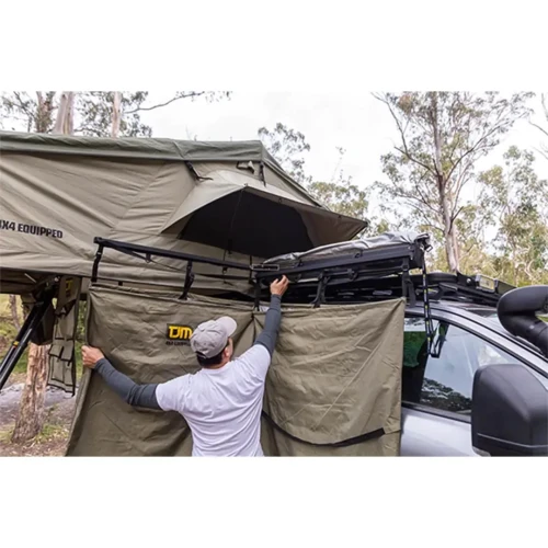 Kompakt og praktisk TJM dusjtelt montert i takprofilen. Oppbevares i en UV-bestandig PVC-pose med glidelås som passer til ditt TJM-tilbehør. Raskt oppsett med en sølvfarget finish for å sikre ditt privatliv. Komplett med taktrekk for dårlig vær og festepunkter. Justerbar til kjøretøyets høyde. Kombiner med vårt TJM dusjkar for å fullføre oppsettet.